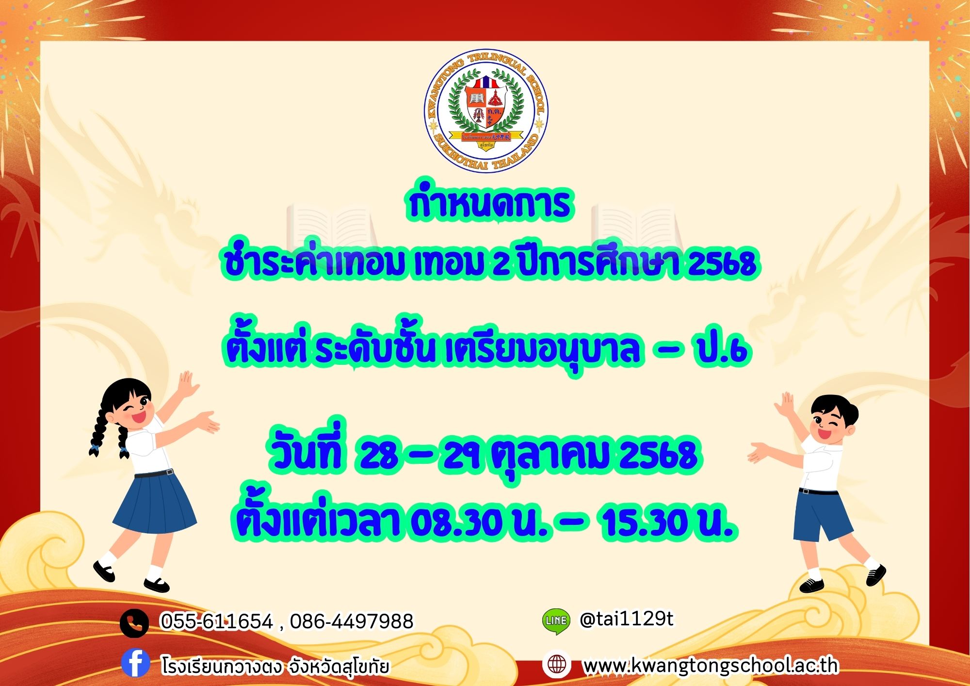 แจ้งกำหนดการชำระค่าเทอม ภาคเรียนที่ 2 ปีการศึกษา 2568 19 ก.ย. 68