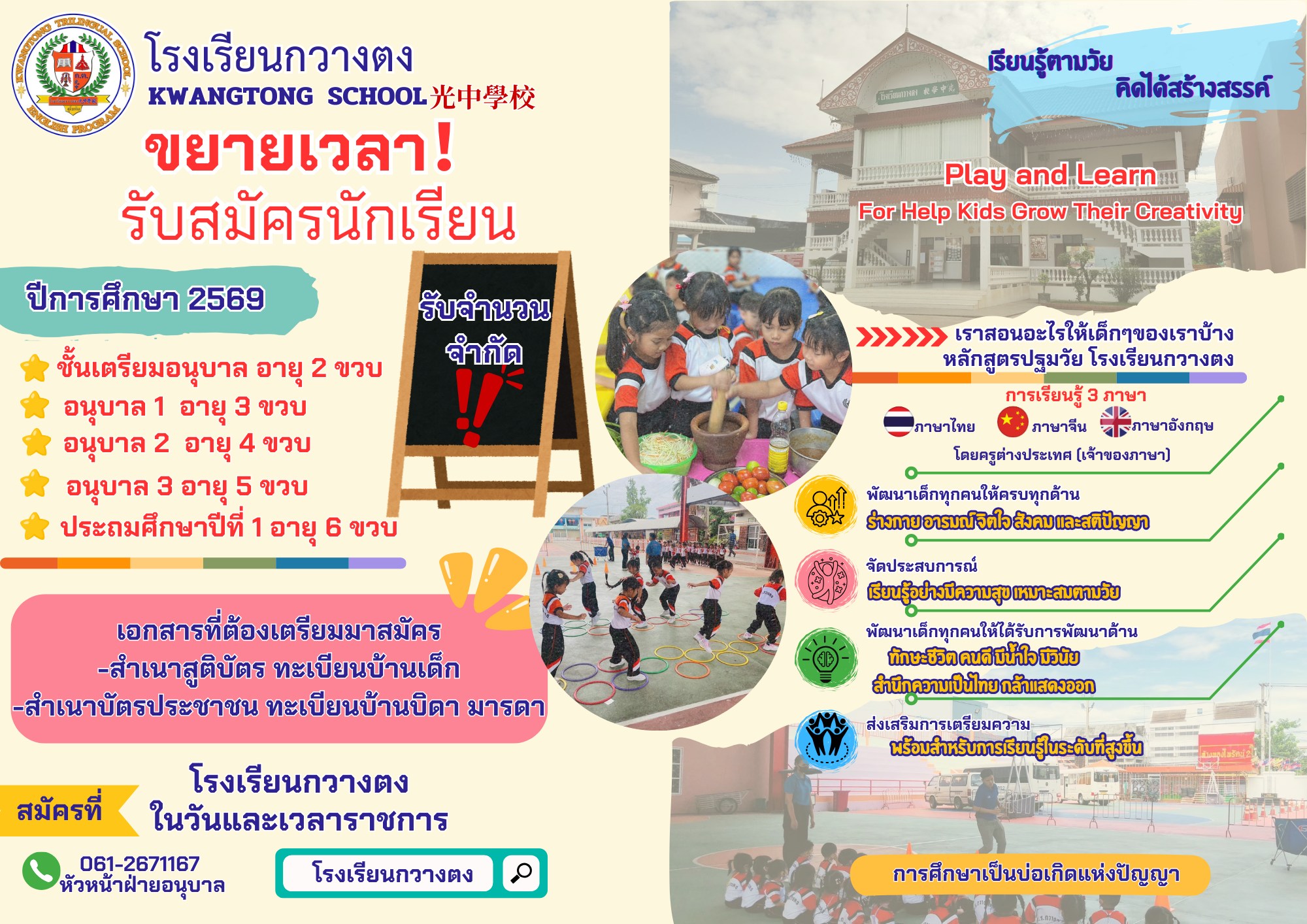 โรงเรียนกวางตง เปิดรับสมัครนักเรียนอนุบาล และ ประถมศึกษา ประจำปีการศึกษา 2569 เปิดรับสมัครเรียนทุกวันไม่เว้นวันหยุดราชการ ติดต่อสอบถามได้ที่เบอร์โทร. 055-611654,086-4497988 เพจFacebook : โรงเรียนกวางตง จังหวัดสุโขทัย